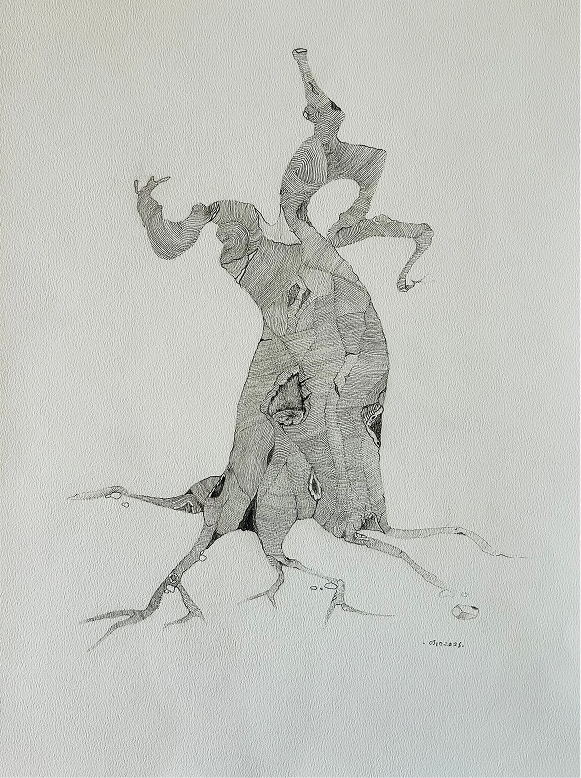 FanjaR suit la canopée de son imaginaire, personnifie l’arbre et raconte dans ses œuvres ses rencontres avec ces arbres qui ont tant à nous dire.
