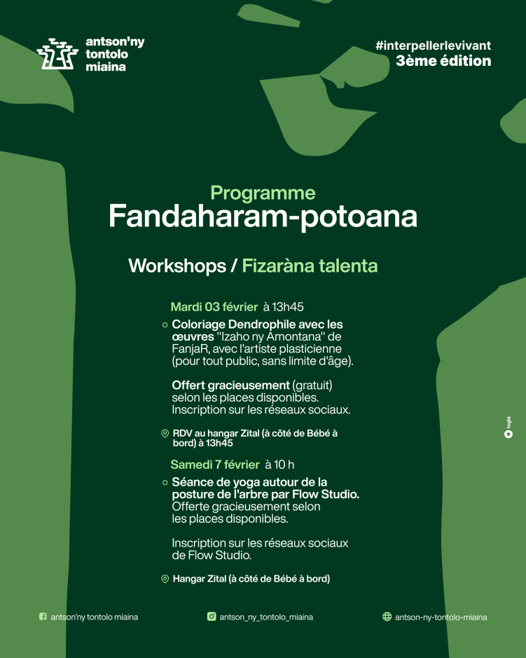 Madagascar avec Ravorona (2024), cette troisième édition poursuit la réflexion autour de l’amour des arbres (Dendrophile) lors du rendez-vous artistique annuel dans la zone Zital, Ankorondrano du 17 janvier au 06 février 2026.