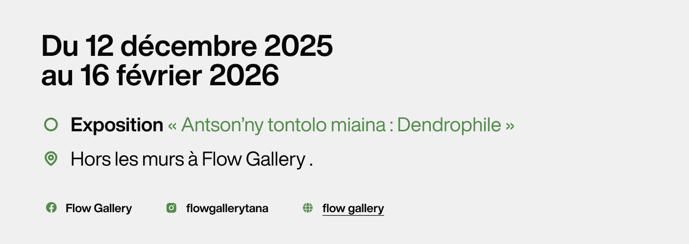 Le thème Dendrophile, met en lumière les arbres en tant que sources d’émotions. En s’appuyant sur la richesse de la biodiversité malgache, l’exposition explore comment l’arbre peut devenir à la fois symbole et acteur de notre rapport au vivant.